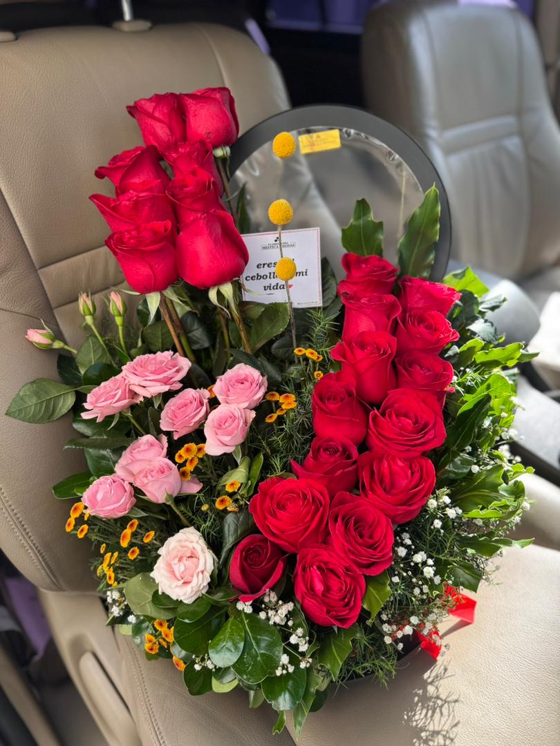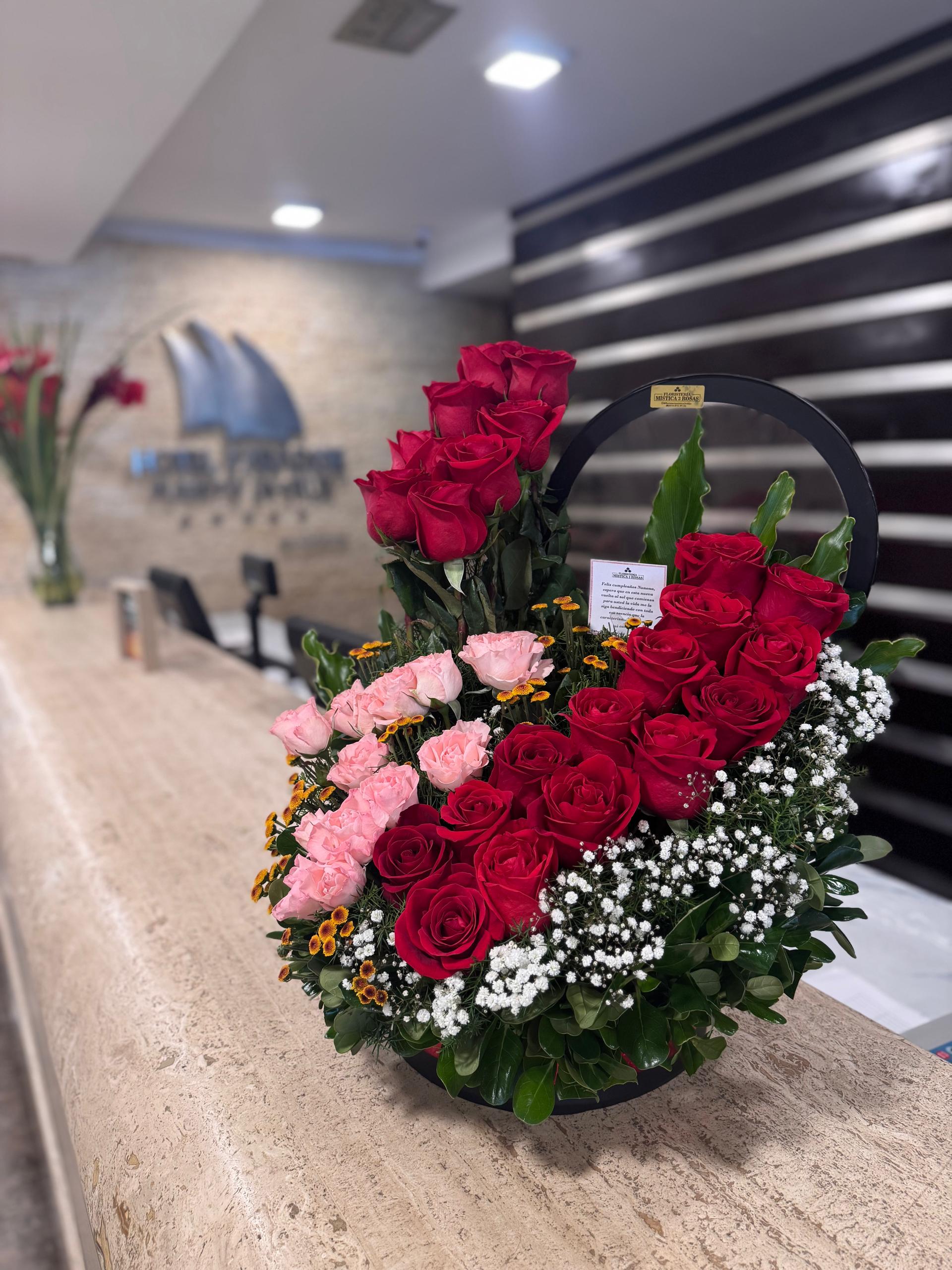 «Entre pétalos de amor y dulzura, este arreglo combina la intensidad del rojo con la suavidad de las rosas bebé, creando un cuadro de belleza sin igual.»
