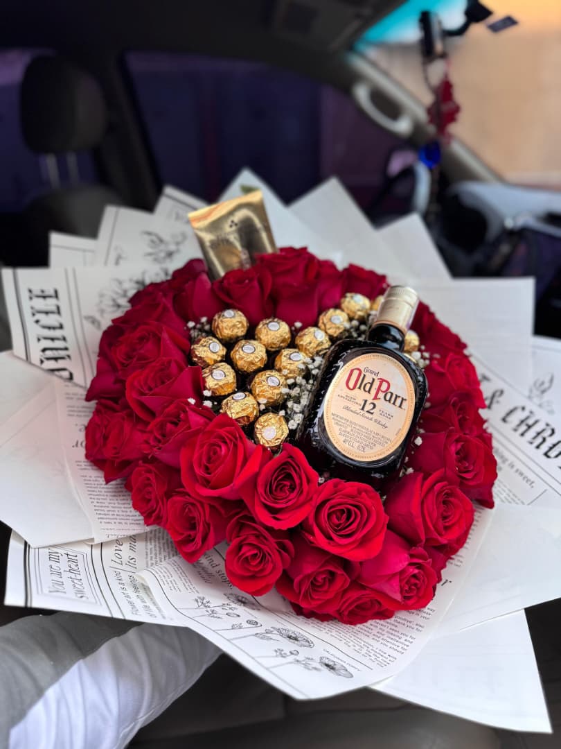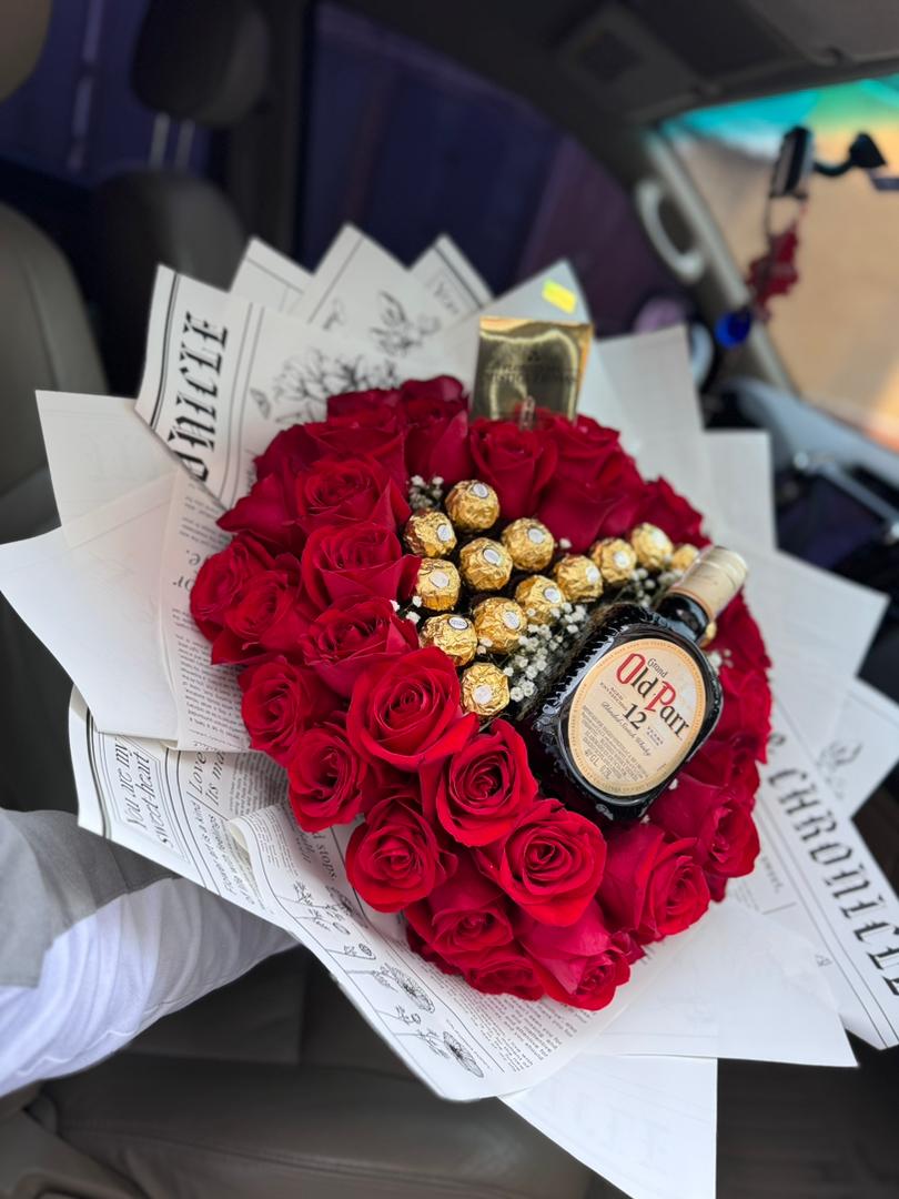 Bouquet buchon combiado con chocolates ferreros y botella OLD PARR